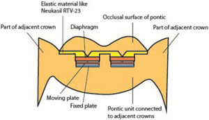 Studying teeth grinding behavior and other oral conditions requires the ability to accurately measure the pressure on the teeth. Placing a sensor in the mouth requires small size devices with powering and measurement techniques that do not hinder the normal life of the patient. To meet these requirements, we designed, using COMSOL, a small, easy to read MEMS capacitive force sensor, with adjustable dynamic range and high sensitivity. The sensor is a capacitive sensor and can be read using commercial RFID tag. A small RFID tag, with 3 mm antenna coil, is integrated with the sensor. The sensor is then implanted inside a pontic or a crown. If a force is applied on the reconstructed tooth (the sensor), a related change in the sensor’s capacitance takes place. Since the sensor’s capacitance is added in parallel to the tag’s original capacitor, the change in the tag’s capacitor results in changing the resonance capacitance of the tag. This can be related to the applied force. Using digital signal processing techniques, the tag’s readings can be measured with high accuracy.