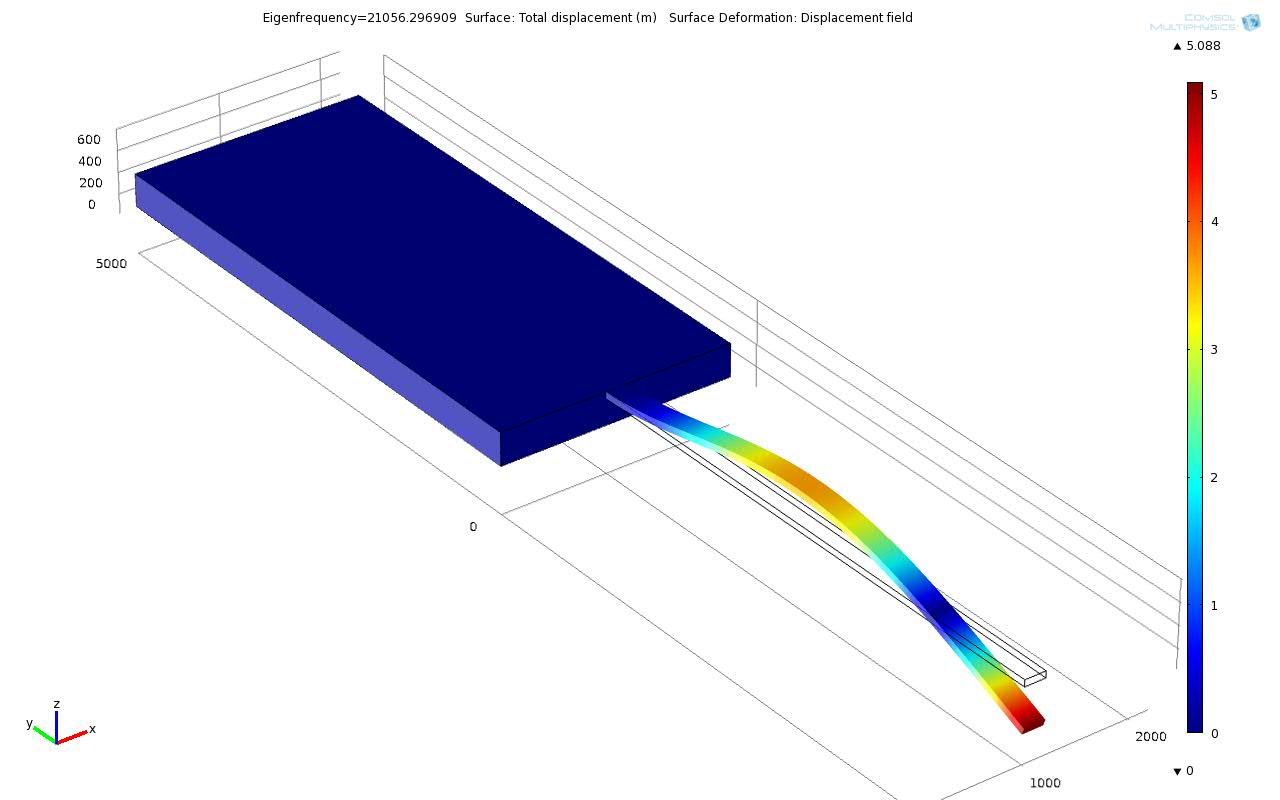 And I was thinking that COMSOL cannot say the real value of displacement by eigenfreq analysis, since I have read one of paper from COMSOL conference about modelling Cantilever. And there are only the pictures of deformations of the cantilever in the first and second mode of resonant freq...And of course the value of 5 different modes of frequencies..That research group was comparing the theoretical value of resonant frequency with FEM and measurement. However, I did not see the legends/values which tell the reader how big is the deflection/displacement.