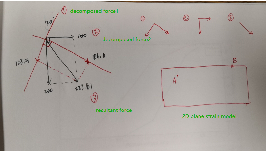 I have built three 2D plane strain models in COMSOL, each model was applied dynamic concentrated forces (1 MHz, last 10 microsecond), which are equivalent, at point A as shown in the figure named 'resultant decomposed force', and the results were the displacement of Rayleigh wave in the far field (at point B) on the free surface.