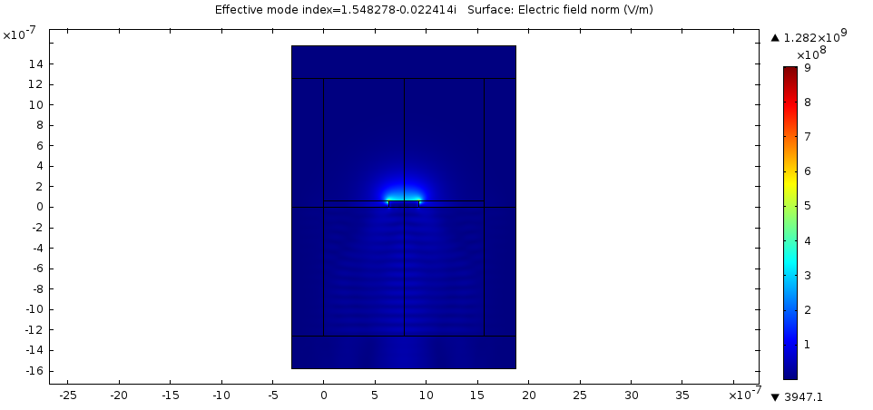 I have a plasmonic waveguide - a silver brick on silicon substrate with glass cladding. I would like to know the modes which this waveguide supports. First I have made a 2D mode analysis and received an effective index for 6 modes around the supposed value (1.55 because surface plasmon should propagate along the silver-glass interface) and electric field distribution. Next I decided to do similar simulation in 3D mode. I have created the wavefuide with silicon and glass slabs around it. The PML layers around the slabs are also used to reduce reflections.