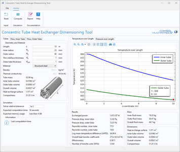 The fluid properties, heat transfer characteristics, and dimensions of the heat exchanger can all be varied. The Nonisothermal Flow multiphysics interface is used to model the heat transfer.