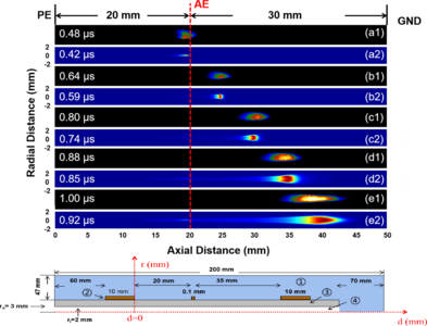 本研究基于COMSOL Multiphysics多物理场仿真平台,利用等离子体模块构建了等尺寸二维自洽流体模型,结合实验深入探究了辅助脉冲电压(APV)对大气压等离子体射流(APPJ)中电离波传播动力学特性的调控机理。仿真工作复现并深入了先前实验研究的关键发现,模型模拟了在辅助电极(AE)上施加不同幅值的APV时,电离波传播路径上的电势分布、电子/离子密度、电场强度及电子温度的时空演化过程。计算结果表明,电离波的产生影响了管外电势的产生与再分布,同时外加APV通过显著改变电离波前端的电势分布,从而有效调控其传播行为。模型与实验证明,降低APV幅值会增大波前与管壁之间的电势差(Δφ),进而增强轴向电场,导致电离波速度加快、波前电子与离子密度显著集中、电子温度升高。同时,更强的径向电场使得等离子体子弹的径向尺寸(FWHM)得以扩展。反之,提高APV幅值则使电荷分布更均匀,起到抑制和缓和放电的作用。本项研究成功结合了实验与仿真结果,对外加辅助电势对APPJ放电动力学的调控物理机制进行了阐述,仿真结果与实验结果具有良好的一致性,COMSOL模型为优化等离子体射流性能提供了理论依据。本研究为材料处理、生物医学等需要精确控制等离子体参数的应用领域提供了实验参考。