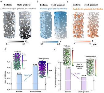 为满足电动汽车对长续航和快充电的需求,提升锂离子电池的能量密度和快充性能至关重要。锂离子电池在快速充放电过程中的电极结构退化问题已成为制约其性能提升的关键瓶颈。尤其在高倍率循环条件下,电极活性颗粒内部会因锂离子浓度梯度和相变引发的非均匀体积膨胀而产生显著的机械应力,进而导致微裂纹的萌生与扩展。本研究建立了耦合锂离子扩散、相变、应力演化及断裂过程的COMSOL模型,系统研究了单晶电极颗粒、二级电极颗粒和厚电极的断裂行为。在单晶颗粒尺度,建立了耦合锂扩散、相变、应力与断裂的相场模型。研究发现脱锂路径具有取向依赖性,导致非均匀相变与晶格失配应力,诱发侧面裂纹形核及沿层状方向的扩展,形成典型层状裂纹。在二级颗粒尺度,揭示了NCM二级颗粒中一级晶粒取向与形貌对倍率性能与结构稳定性的影响机制。研究表明,一级晶粒径向排列并结合锂扩散各向异性可显著抑制裂纹扩展,表面包覆改性进一步提升了力学稳定性。在厚电极尺度,开发了电化学-力学耦合模型,解析了厚电极中离子/电子传输与应力分布的相互作用,发现不同深度处颗粒具有差异化力学失效行为。提出电极微结构与电子、离子及反应驱动通量的梯度匹配策略,优化了传输-反应动态平衡,协同提升了快充性能与机械稳定性。本研究系统建立了电极颗粒形貌-取向-稳定性之间的构效关系,为发展高性能、高稳定性电极材料提供了重要理论依据与设计策略。