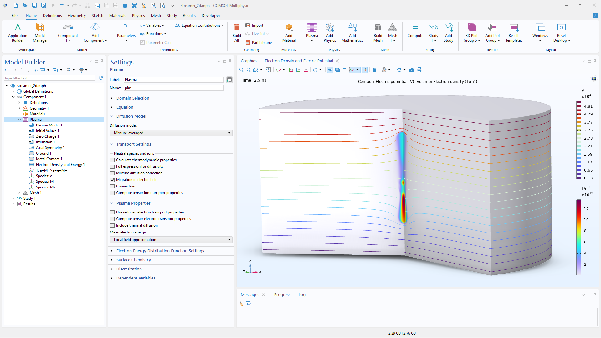 プラズマ化学は, 現実的なシミュレーション結果を得るために非常に重要です. プラズマモジュールを使用すると, 電子衝突反応, 重化学種間の反応, および表面反応を定義することができます.