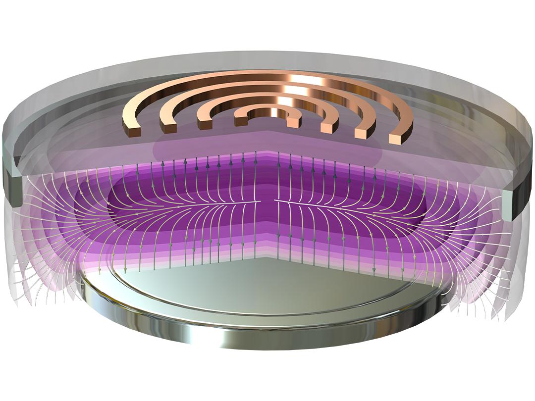 The Inductively Coupled Plasma with RF Bias interface1 is used to study discharges that are sustained by induction currents and by an RF bias. This multiphysics interface connects the plasma conductivity from the Plasma, Time Periodic interface to the Magnetic Fields interface and couples the electron heating resulting from the induction currents back to the Plasma, Time Periodic interface. The magnetic field is solved for in the frequency domain and the plasma is solved for in the time domain.