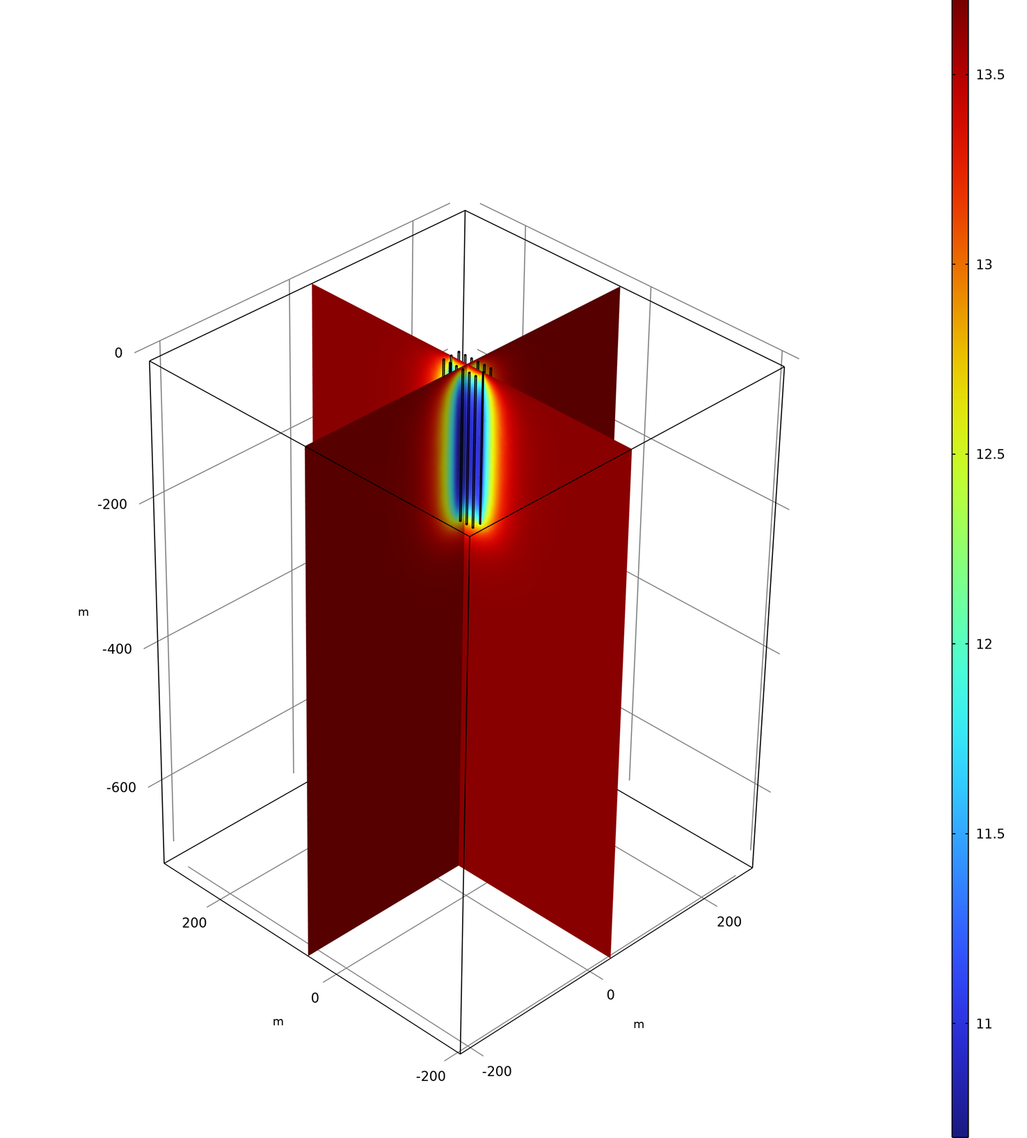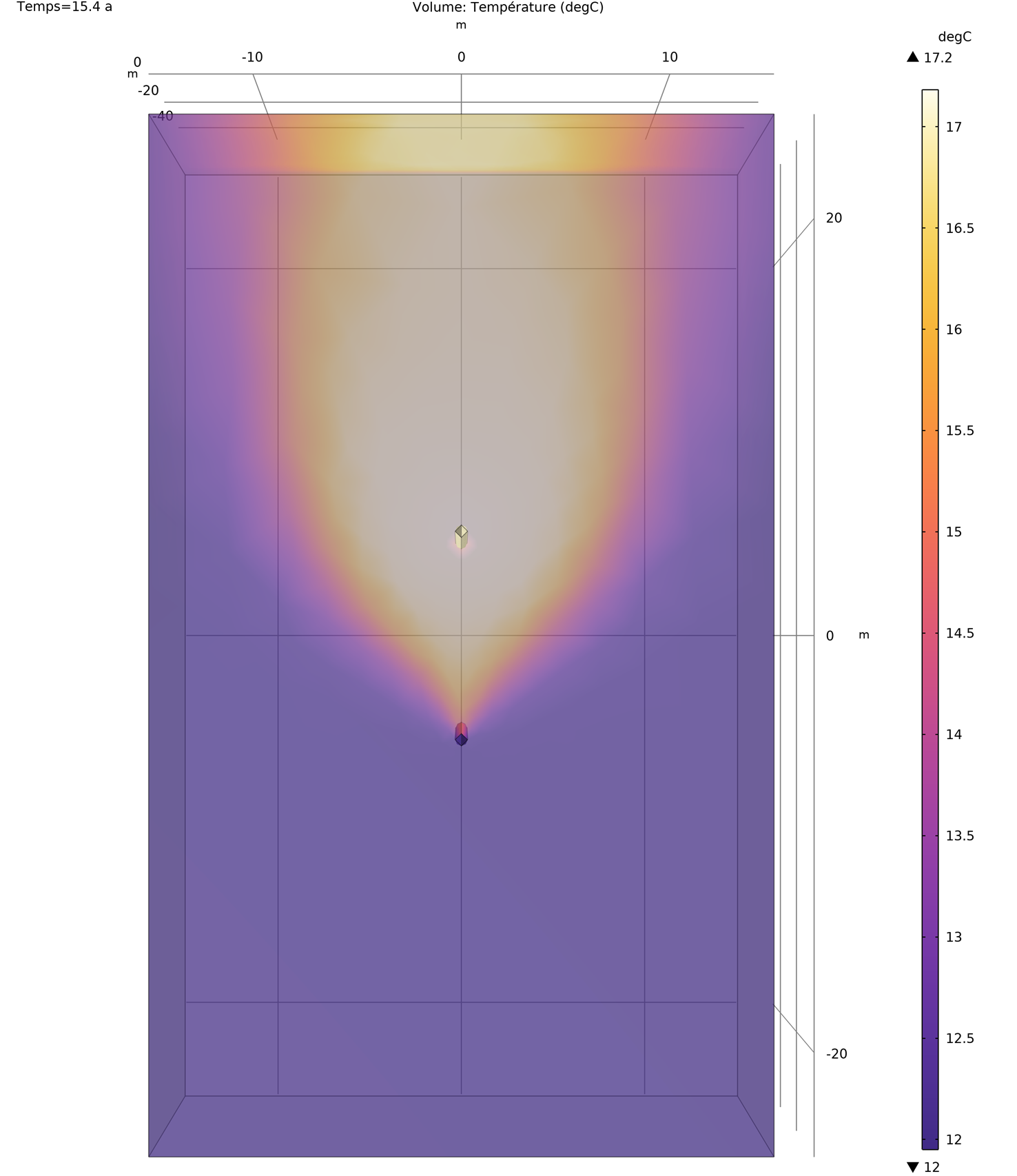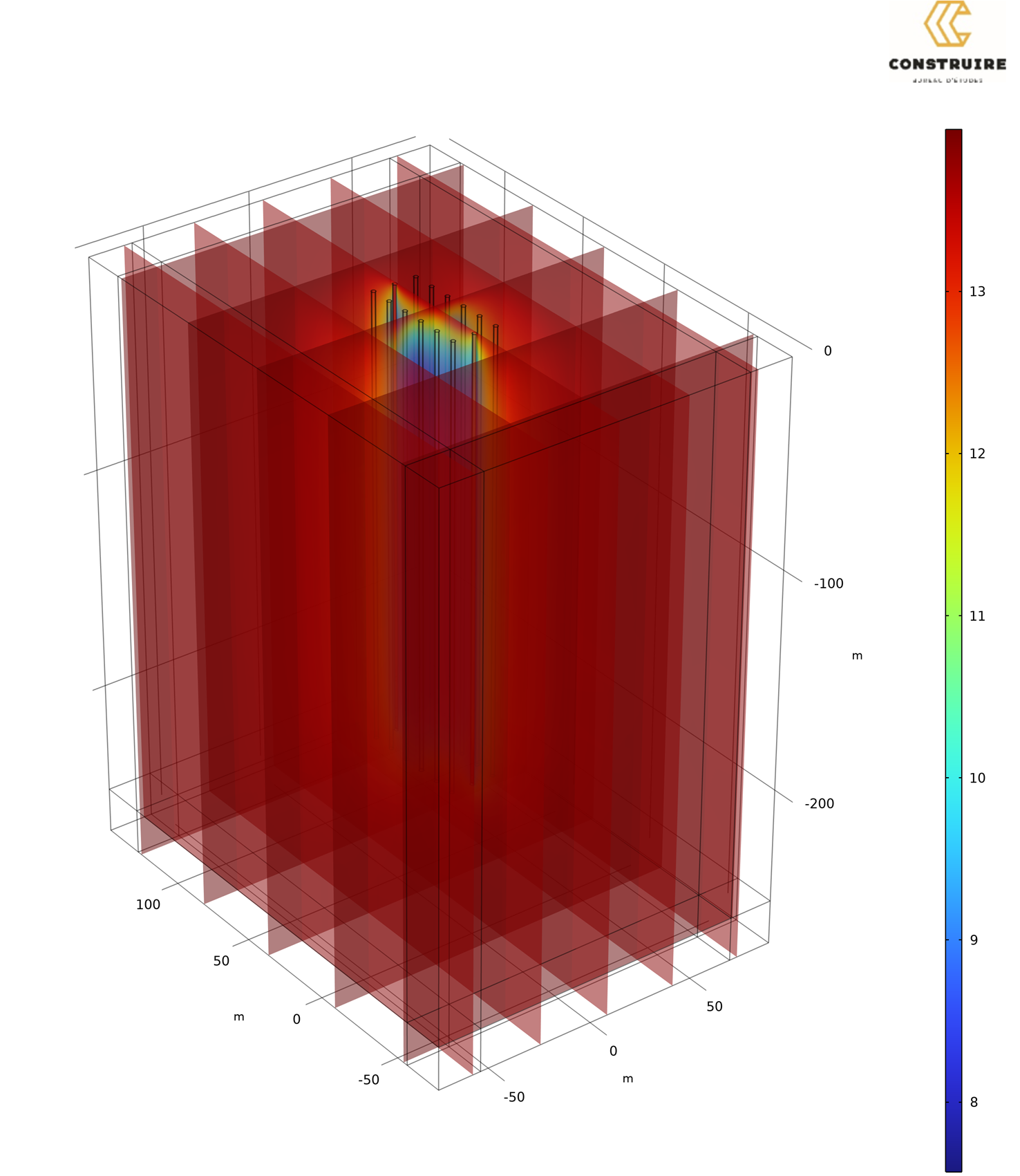 Résultat d'un calcul 3D de champs de sondes, issu de l'application géothermique de CONSTRUIRE