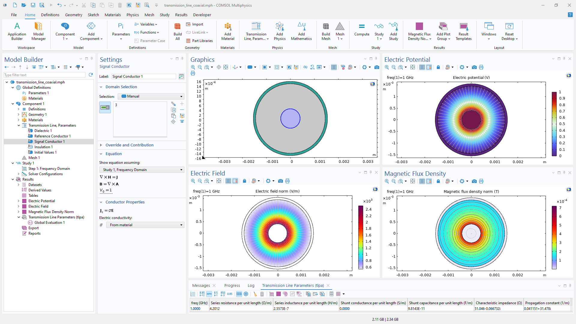 Transmission Lines of a Coaxial CableThe electric potential, electric field, and magnetic flux density of a coaxial cable. |
