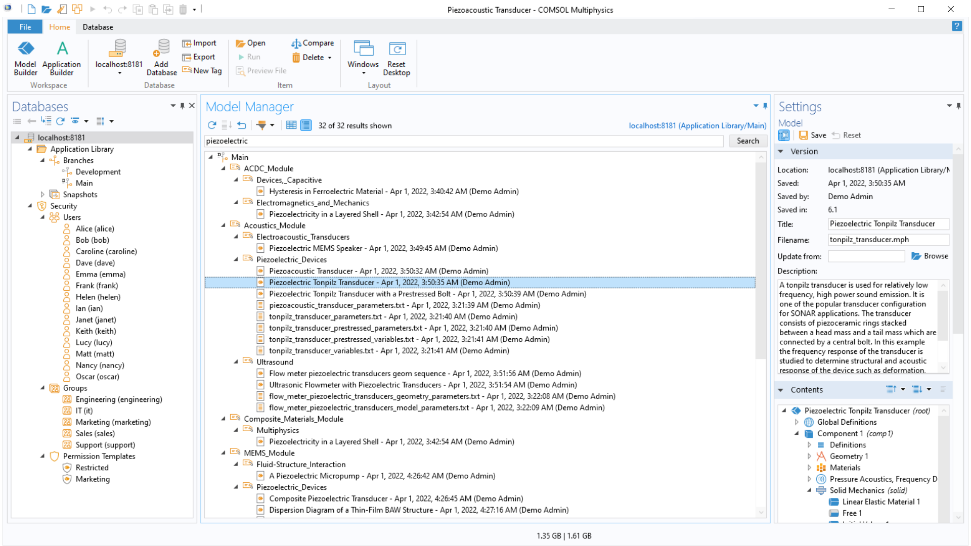 Model Manager SettingsA screenshot from the Model Manager UI within the COMSOL Desktop® that shows the different databases that have been set up to administrate and structure models, along with branching, version control, feature lists, and the folder system used to manage the simulation. The model tree of a selected model can be previewed without opening the model. |