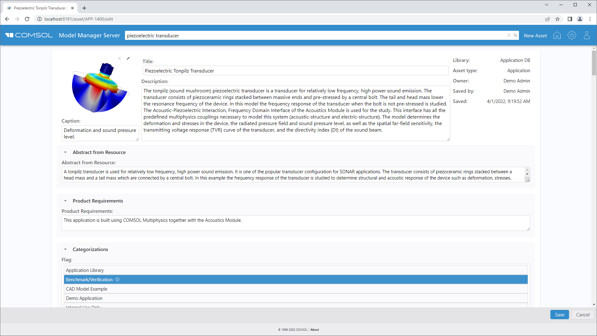 Model Manager Server Asset InformationClicking into an asset allows you to add files and metadata (abstract, thumbnail image, product requirements, etc.) |