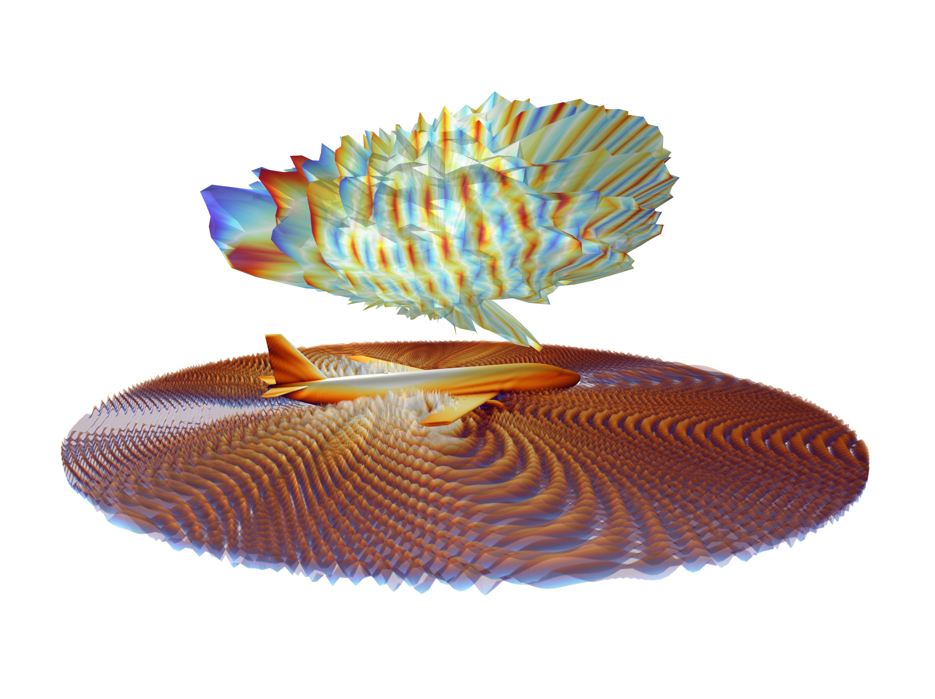 Airplane Antenna SimulationThe radiation pattern of a Wi-Fi antenna operating at 850 MHz, placed on the fuselage of an airplane. The model is solved with a combination of the finite element method (FEM) and boundary element method (BEM).