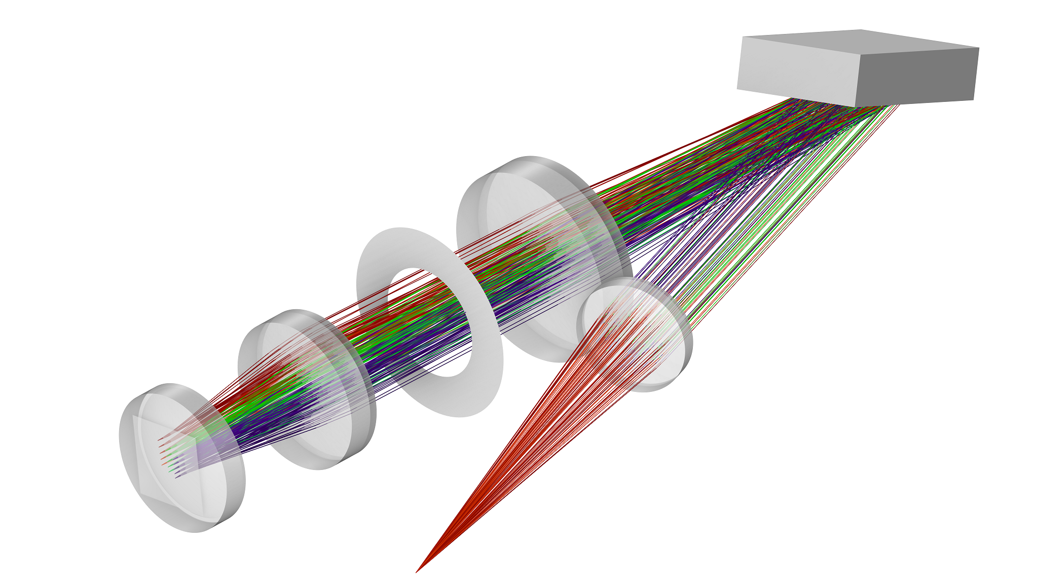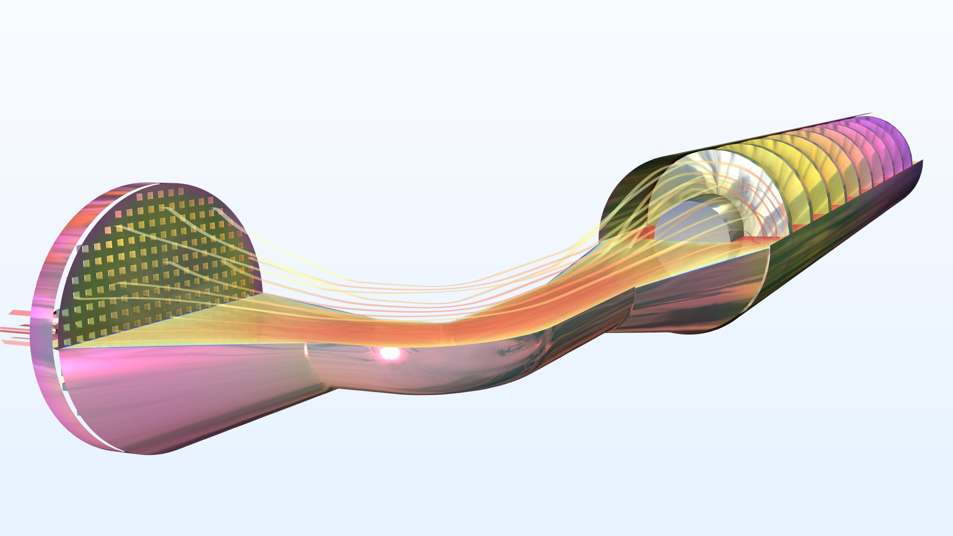 Optic Lens SystemCOMSOL Multiphysics® version 6.0 provides advanced visualization functionality, including realistic transparency of materials like glass, as shown in this ray optics simulation of a system of lenses.