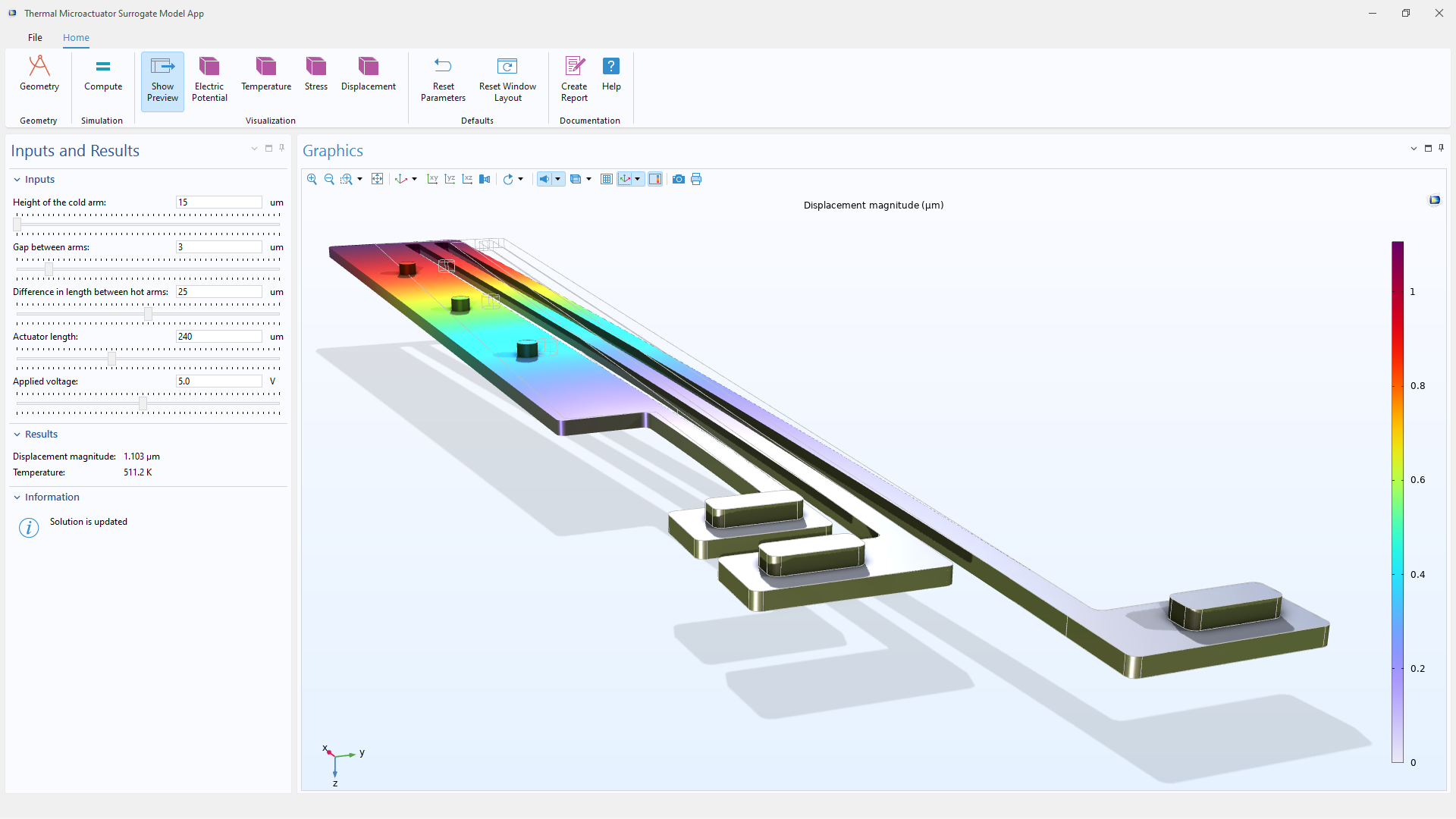 A simulation app of a MEMS thermal actuator powered by a DNN surrogate model enables extremely fast model evaluation of quantities such as temperature, displacement, voltage, and stress. The surrogate model was trained using GPU acceleration on a standard workstation.