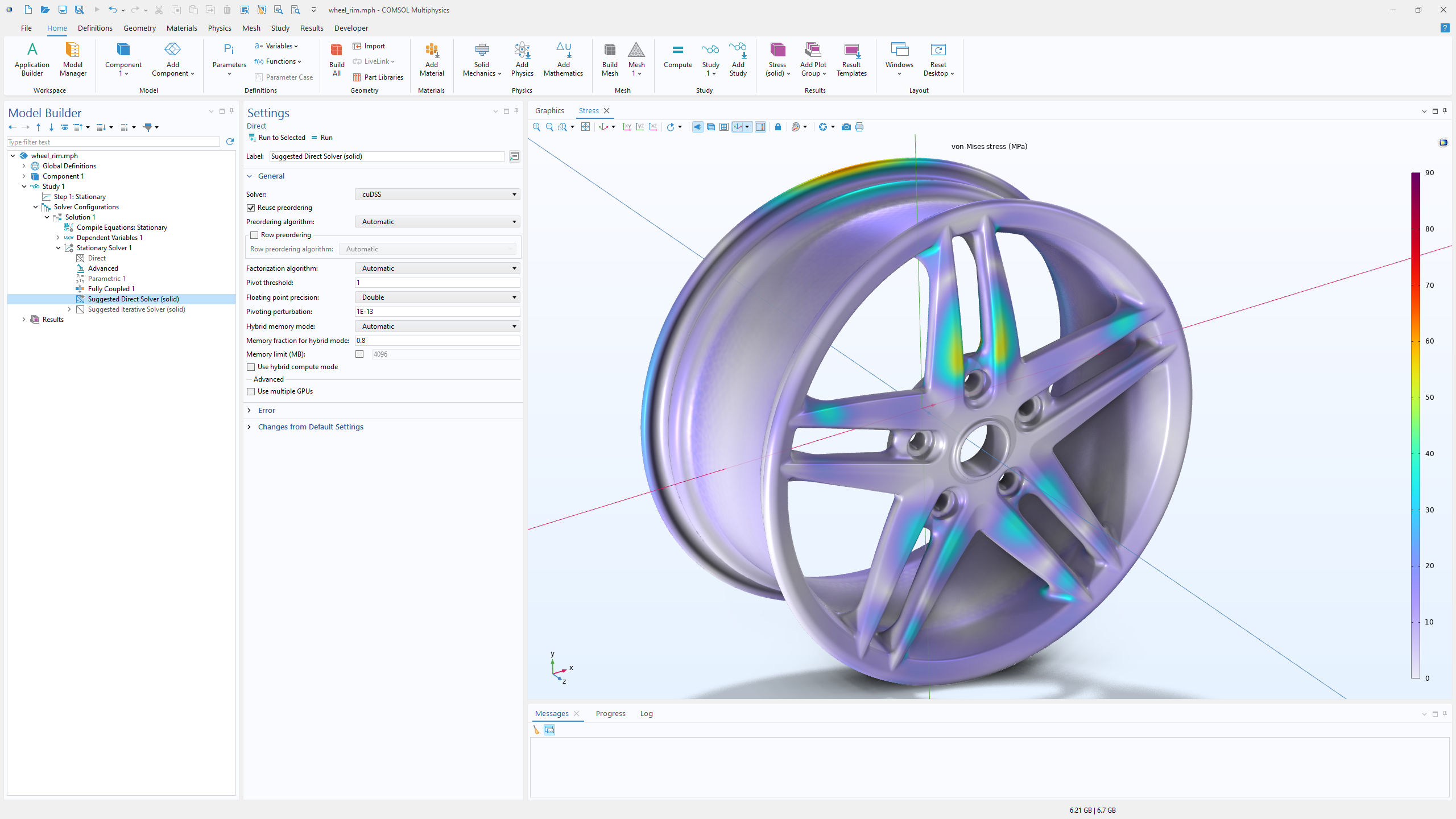 GPU acceleration with NVIDIA cuDSS also benefits conventional structural finite element analyses on standard workstation hardware. In this wheel rim example, the effective stress is visualized, and the GPU-based solve on an NVIDIA RTX™ 5000 Ada Generation workstation GPU achieved a 2× speedup compared with a CPU-based solve on an Intel® W5-2465X processor.