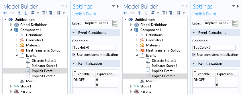 The two indicator states are used within two different implicit events features, the first of which triggers on the condition TooHot>0 which goes from false to true when the average temperature goes above 95°C. When this event triggers, the ONOFF discrete state is set to zero, turning off the heat load. The second condition triggers on the condition TooCold<0 which goes from false to true when the average temperature drops below 90°C, and sets ONOFF to one, turning the load back on.